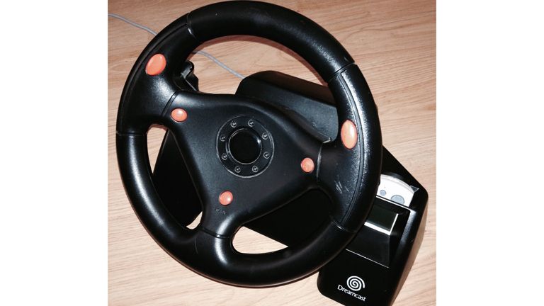 The Dreamcast's official steering wheel is an interesting device. Unlike many steering wheel controllers from the era, it doesn't have a gear stick or pedals but some early versions do have a connector port on the rear for a set of pedals that never appeared. There's a slot for a VMU on the right and the wheel itself has a nice level of turning resistance thanks to the large piece of elastic wrapped around the internal steering column. Never released as an official product in the US, the Race Controller was instead licensed by Agetec and marketed as the Rally Wheel.