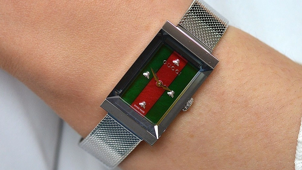 The G-Frame sports the brand's iconic red and green colours as stripes on the dial, surrounded by a stainless steel case and a mesh bracelet. The case sits just 21mm wide, but – perhaps more impressively – only 8mm tall, so it should be entirely unobtrusive on the wrist.