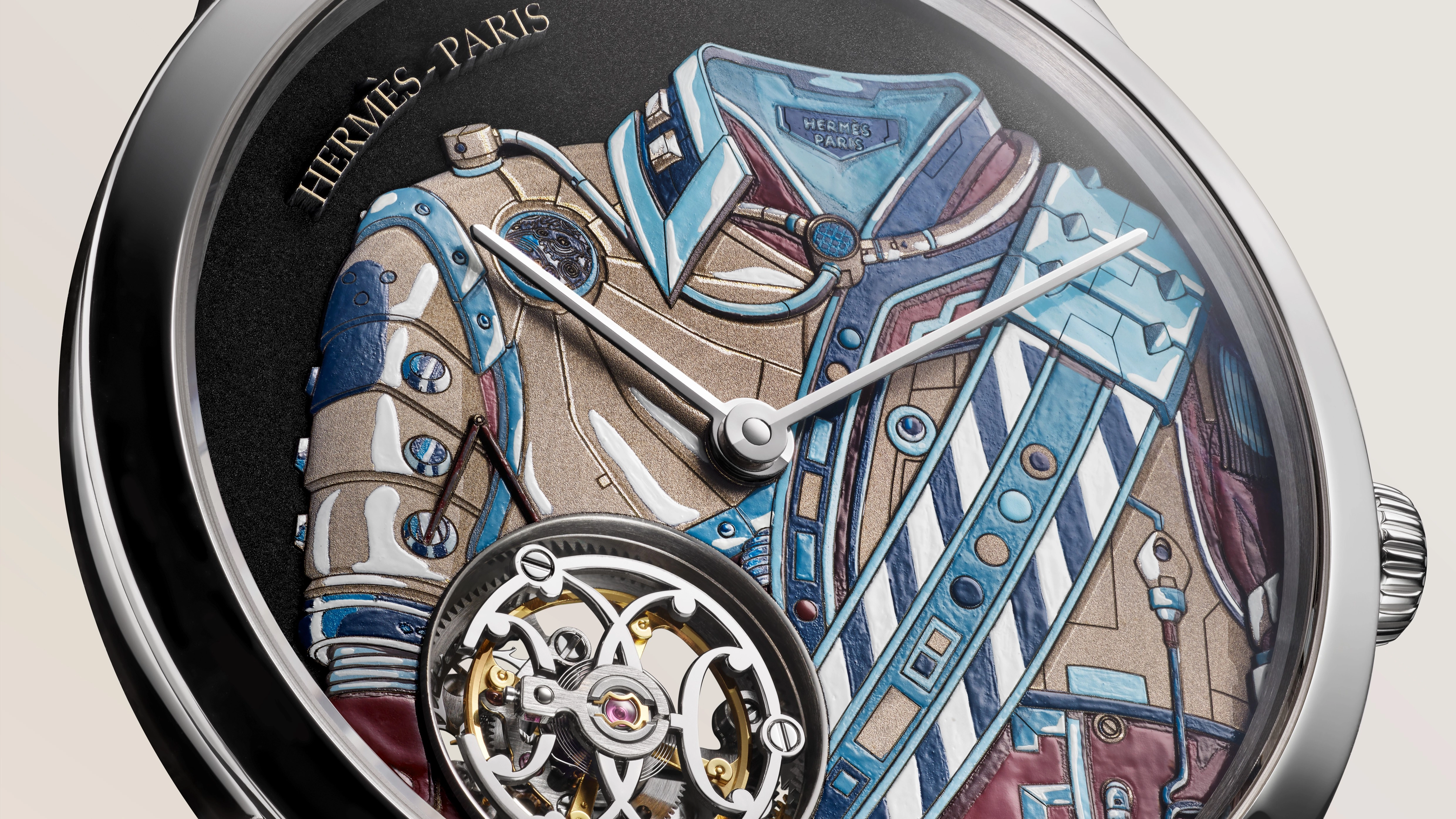 The dial itself is crafted from a mix of painting and engraving. Both sport a beige base, with one using green and blue accents and the other using blue and red accents. Both also sport the Hermès Paris logo at the 11 o'clock spot.